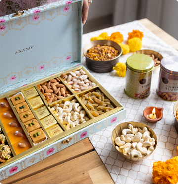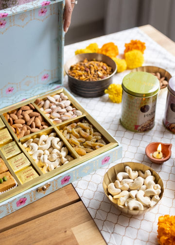 Sumptuous assortment of dry fruits & nuts packaged with a touch of Royalty