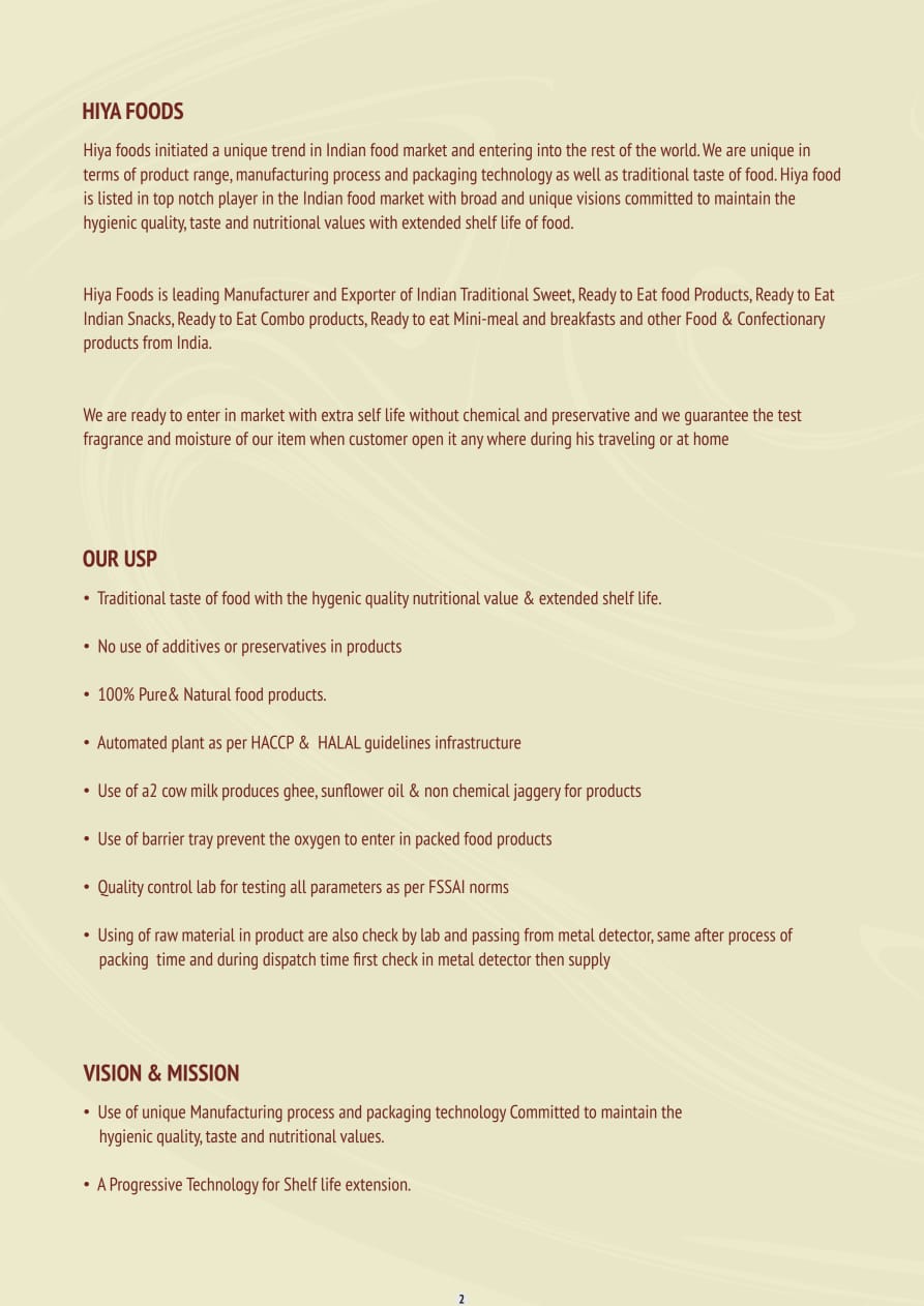 .Hiya Foods Manufacturer and exporter of Ready to eat food, Ready to cook, Indian Traditional sweet as well as HORECA Products from India.